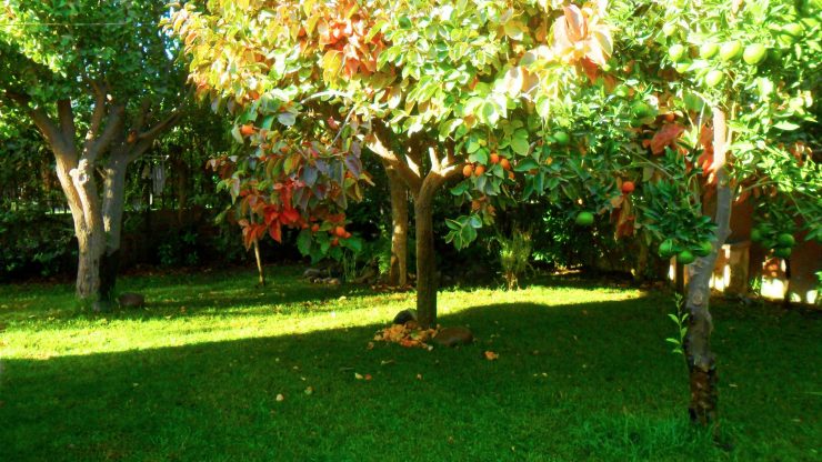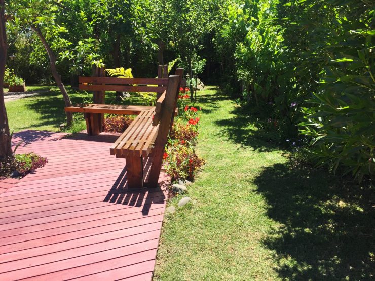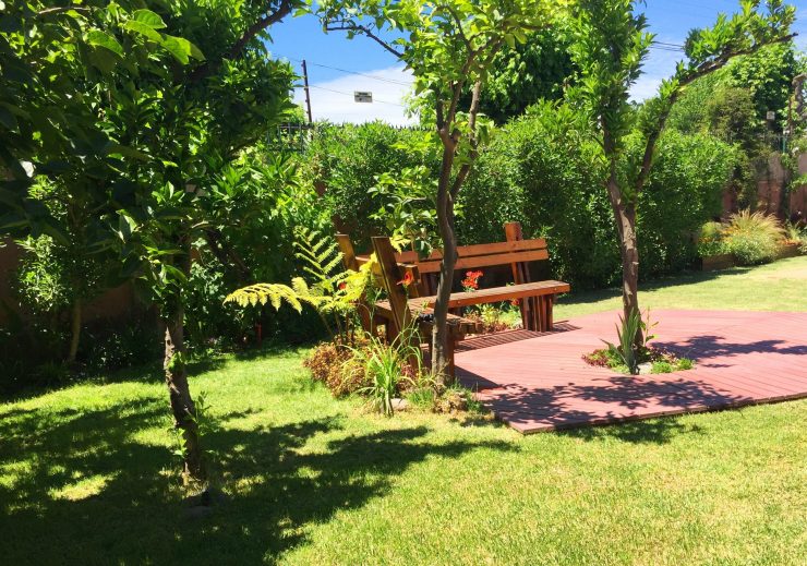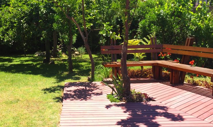 Ante la petición de una terraza con radier de hormigón y la eliminación de un árbol existente, se propuso la construcción de una plaza deck a ras de suelo: se cambia el hormigón por tablas de plástico reciclado, el cual garantiza una larga vida útil siendo resistente a las implicancias del frío y la humedad, y a la vez, se incorpora el árbol en vez de sacarlo. Se construye una banca para dar lugar a una plaza bajo el naranjo, constituyendo el elemnto central de la terraza.