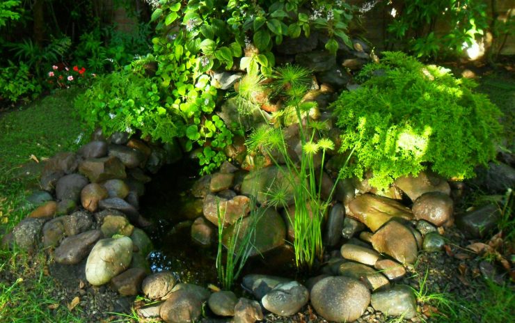 El reciclaje y la reutilización de materiales es uno de los ejes del proyecto. Se utiliza una cámara de hormigón encontrada en el jardín, para ganar altura en la construcción de un cuerpo de agua con cascada.
