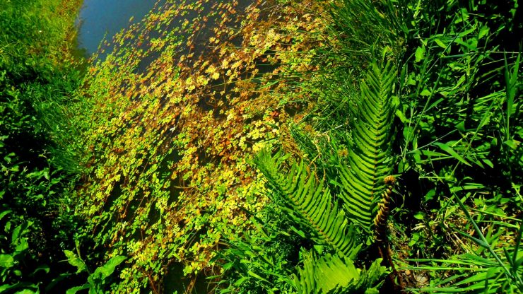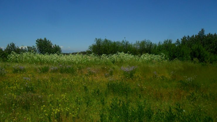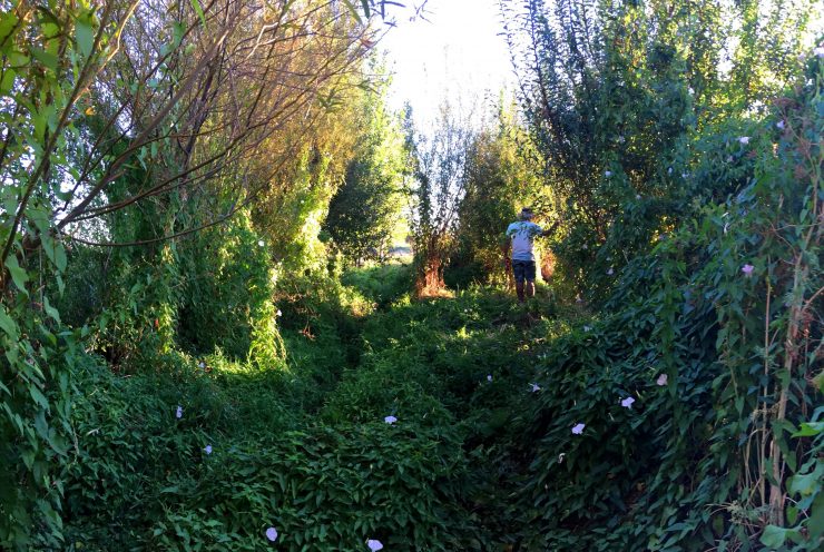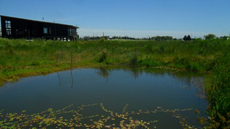 La zona se encuentra ferozmente deteriorada debido al uso agrícola y ganadero previo a la parcelación actual. Sin embargo, el sitio del proyecto cuenta con dos canales de regadío que atraviesan el predio en su eje longitudinal y transversal, los cuales dan lugar a exuberantes bordes de vegetación. A partir de esto, constatamos que los sectores con mayor diversidad, fuera de la flora silvestre de temporada, son los aledaños a los cursos de agua (canalizaciones de regadío, cotas más bajas y sector estanque).