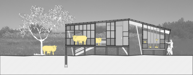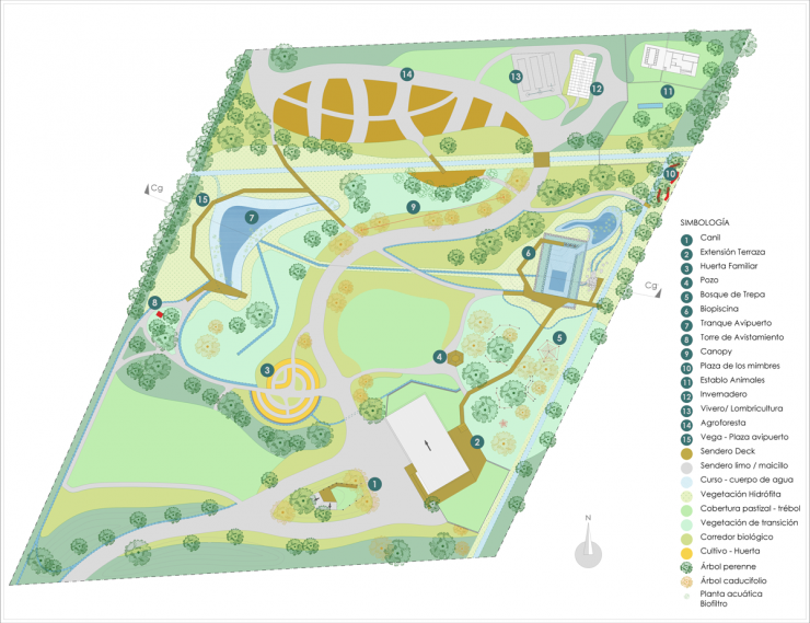La zona Sur está destinada a las actividades recreativas y familiares, mientras que la zona norte, dividida por el canal existente, contempla la zona de trabajo y cultivo. Se propone un sistema de colaboración entre animales y plantas. Los animales, al comer los prados, ayudan a realizar un manejo activo (pastoreo dirigido) de control de malezas, prescindiendo del uso de herbicidas; y a su vez ,son fuente de generación de desechos orgánicos (guano) para la preparación de biofertilizantes, los cuales al ser aplicados a los cultivos, ayudan a la regeneración natural de los suelos, base microbiológica esencial y primaria para la reactivación de los ecosistemas.